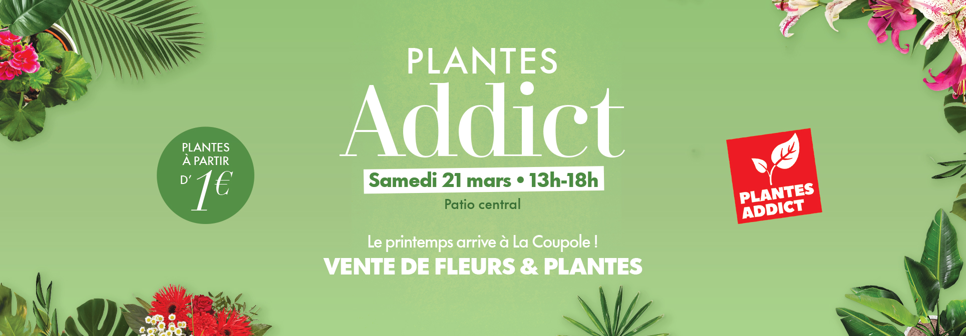 Le samedi 21 mars, de 13h à 18h, La Coupole vous invite à célébrer l’arrivée du printemps avec une animation éphémère en collaboration avec Plantes Addict. Pendant toute l’après-midi, venez découvrir une vente exceptionnelle de fleurs et de plantes !